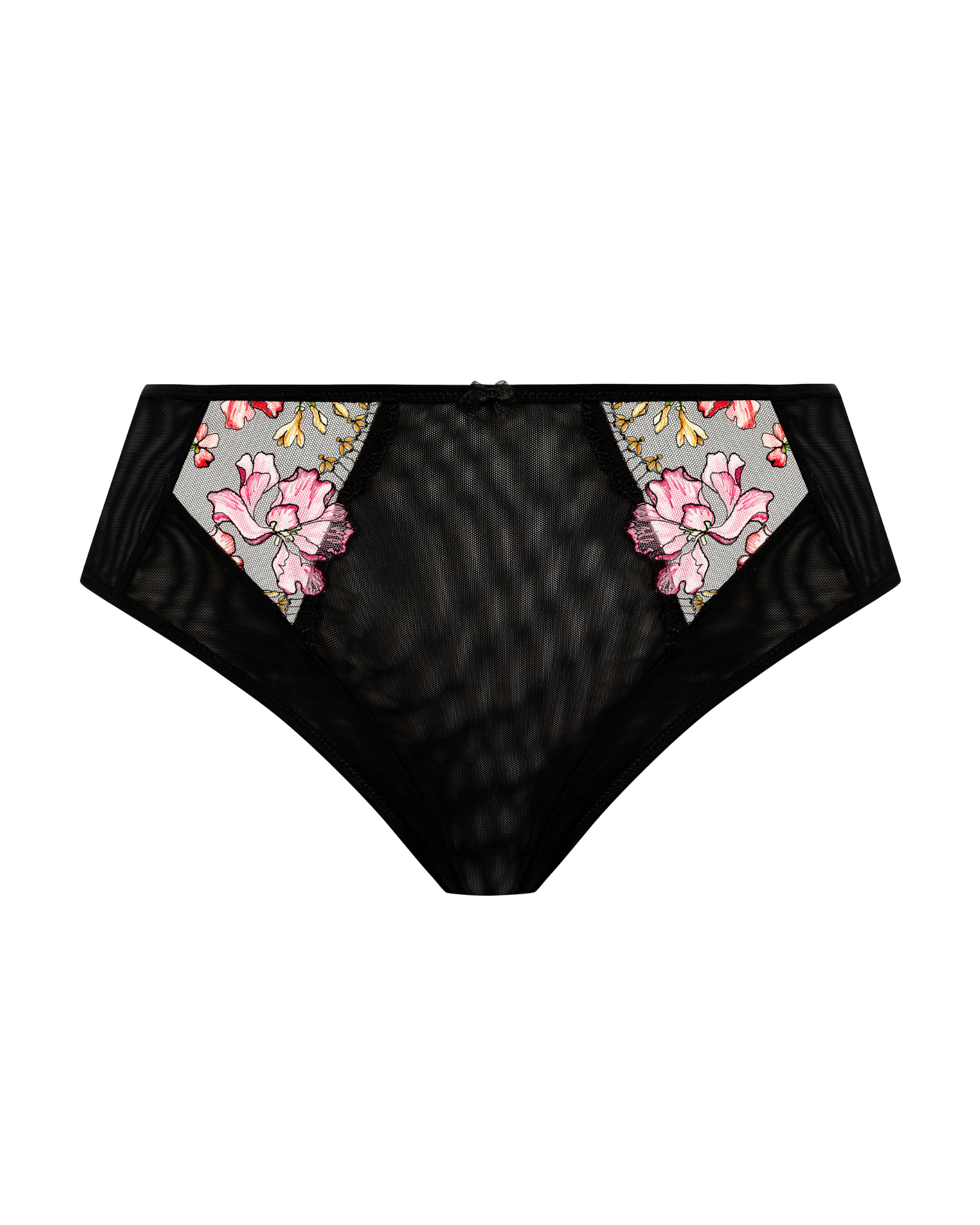Teagan High Leg Brief features stunning over-printed embroidery, multi-coloured flowers bloom in shades of yellow, pink and orange on a black base. Sheer and semi-sheer mesh with keyhole detail at back.
