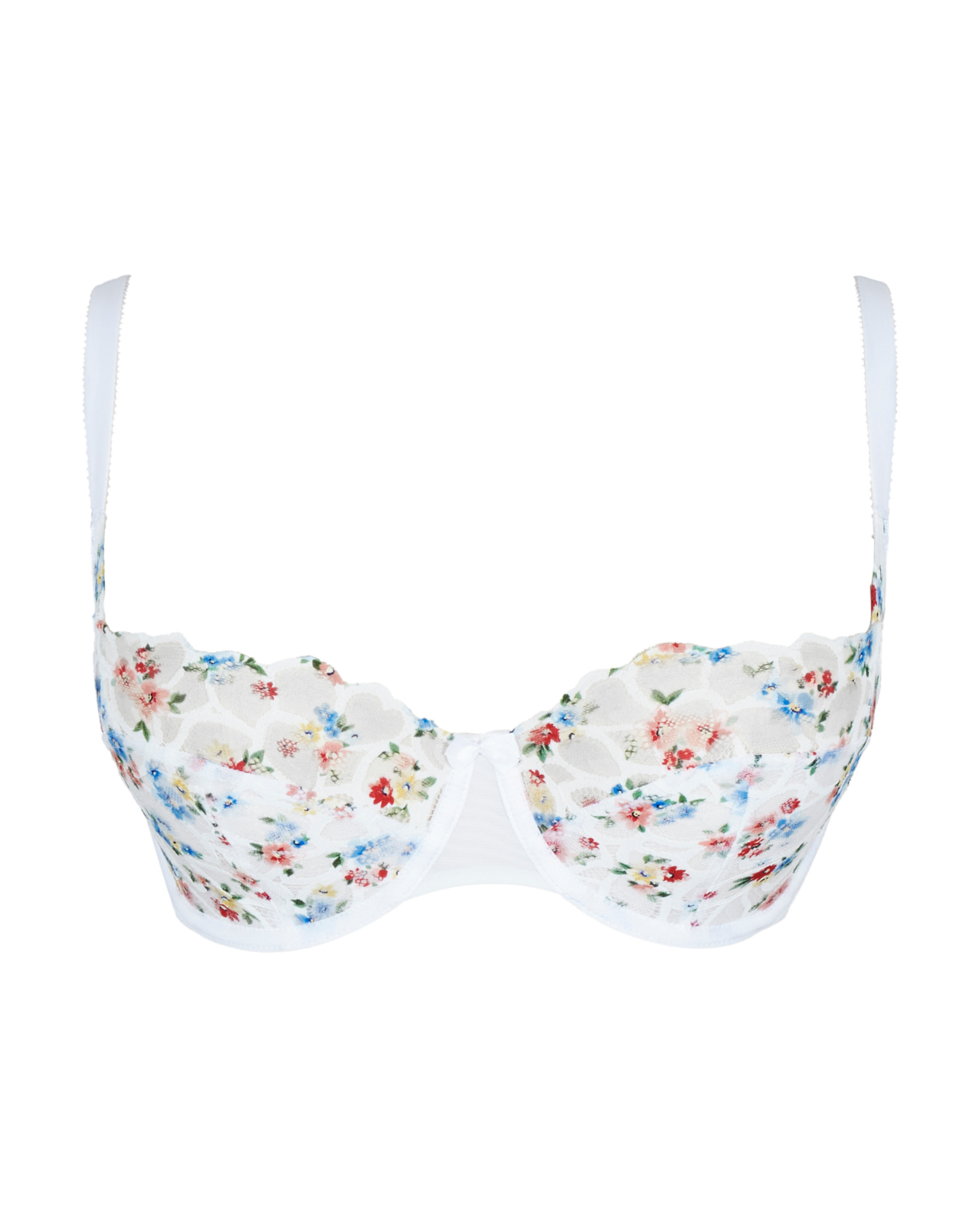 Allure Demi Balcony Bra is designed for women that appreciate a little everyday luxe without full coverage. This low coverage demi balcony bra has stretch lace cups that flexes effortlessly and perfectly frames your curves with a lighter, delicate look. Featuring a dramatic shelf like neckline that enhances cleavage in contemporary lace in a vibrant floral print on crisp white. Allure Demi is a fresh take on springtime elegance.