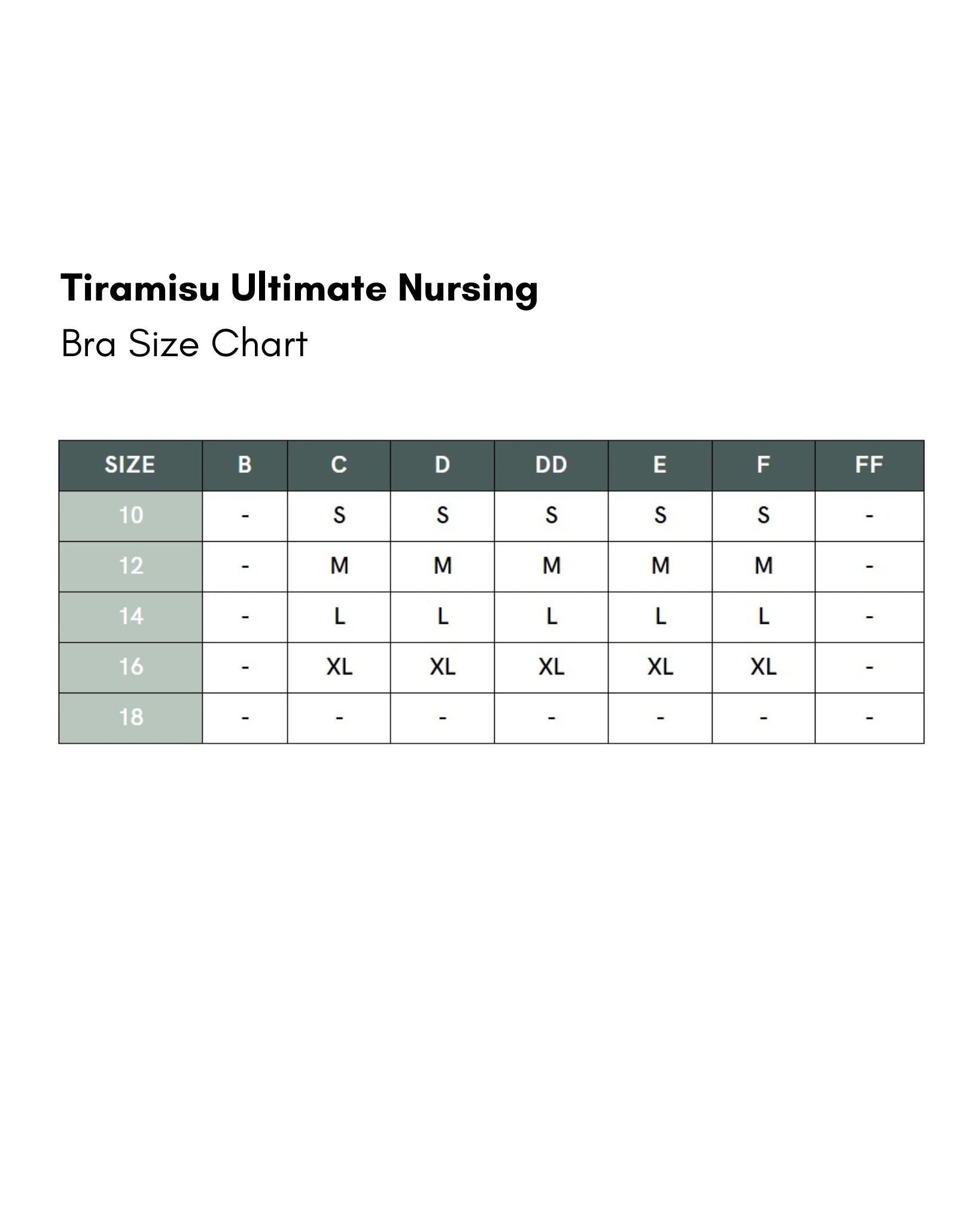 This bra is ranged it will grow with you to accommodate your changing bust. Size range S-XL to fit sizes 10C-16F. See size chart for your perfect fit.